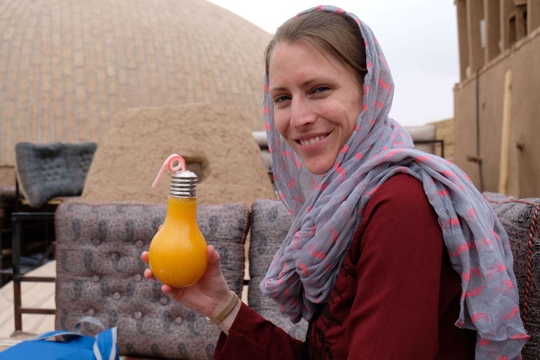 Zum Glück haben wir für heute einen Tagesausflug zu verschiedenen Sehenswürdigkeiten außerhalb Yazds gebucht, weshalb die morgendliche Müdigkeit schnell vergessen ist. Als wir nach dem sehr schönen, aber auch anstrengenden Ausflug wieder in der Stadt sind, möchten wir am liebsten zurück in die Wohnung. Doch Muhammad ist per Anruf nicht zu erreichen und auch über Whatsapp antwortet er nicht. So bleibt uns nichts anderes übrig, als bei einem frischen Fruchtsaft in einem Restaurant auszuharren.
